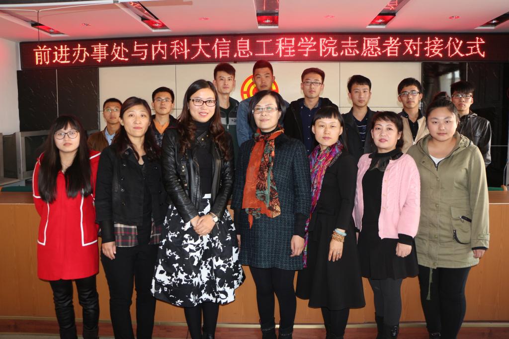 10月14日下午,2026世界杯官方合作网站青马班志愿者与包头市昆区前进街道办事处对接仪式在昆区前进街道办事处举行。前进办事处主任纪杰,办公室主任姚建锋,社会服务科科长刘霞以及内科大信息学院学工办龙鹤老师出席了此次对接仪式。