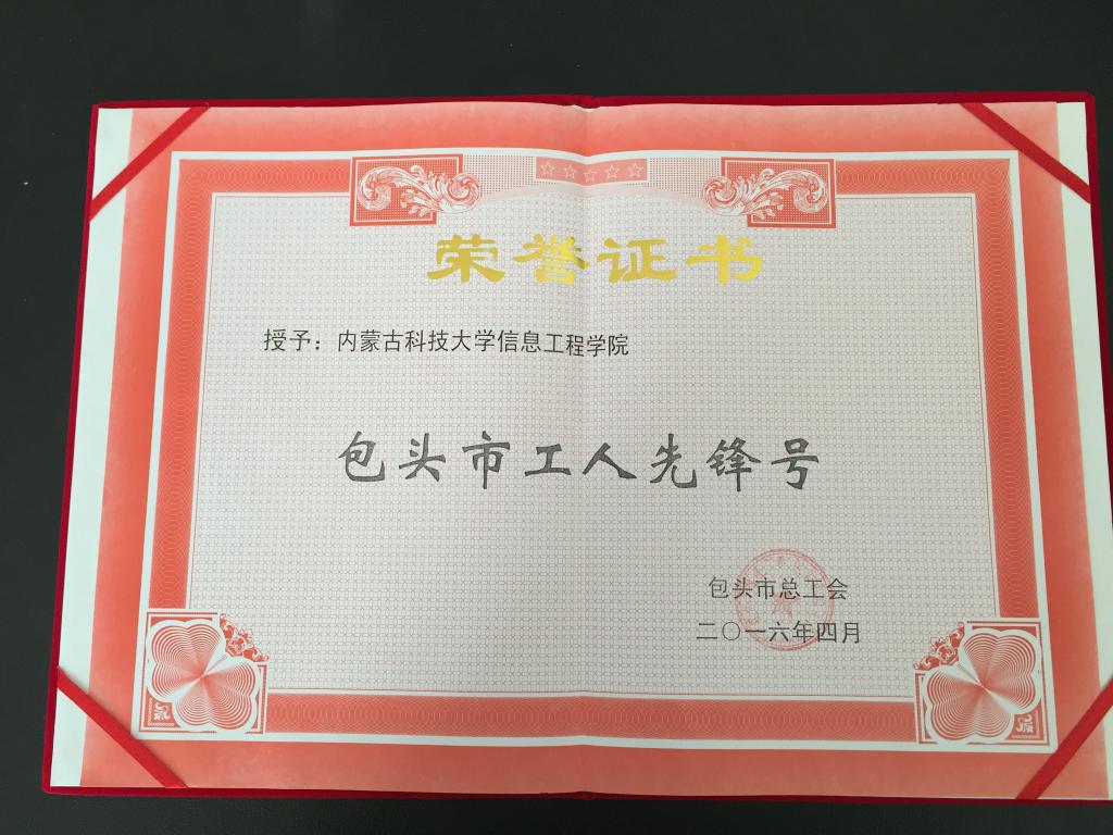 2016年4月30日上午,在包头市总工会二楼会议厅举行的庆祝“五一”国际劳动节表彰大会暨劳动竞赛启动仪式上,信息工程学院被授予“包头市工人先锋号”荣誉称号。本次会议为表彰先进,肯定成绩,激励全市各族职工在实施“十三五”规划中建功立业,包头市总工会共表彰授予20个先进单位包头市五一劳动奖状、授予70名先进个人包头市五一劳动奖章、授予60个车间班组包头市工人先锋号称号。