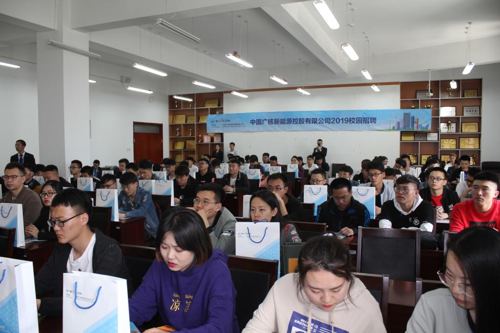 宣讲会上,中广核公司通过播放宣传片、PPT展示、面对面交流等方式向同学们介绍公司的概况、职业发展方向、人员需求以及选择该单位的理由等方面作了详细宣讲。活动中,在中广核公司实习和工作过的学长学姐站台为同学们解答疑问。