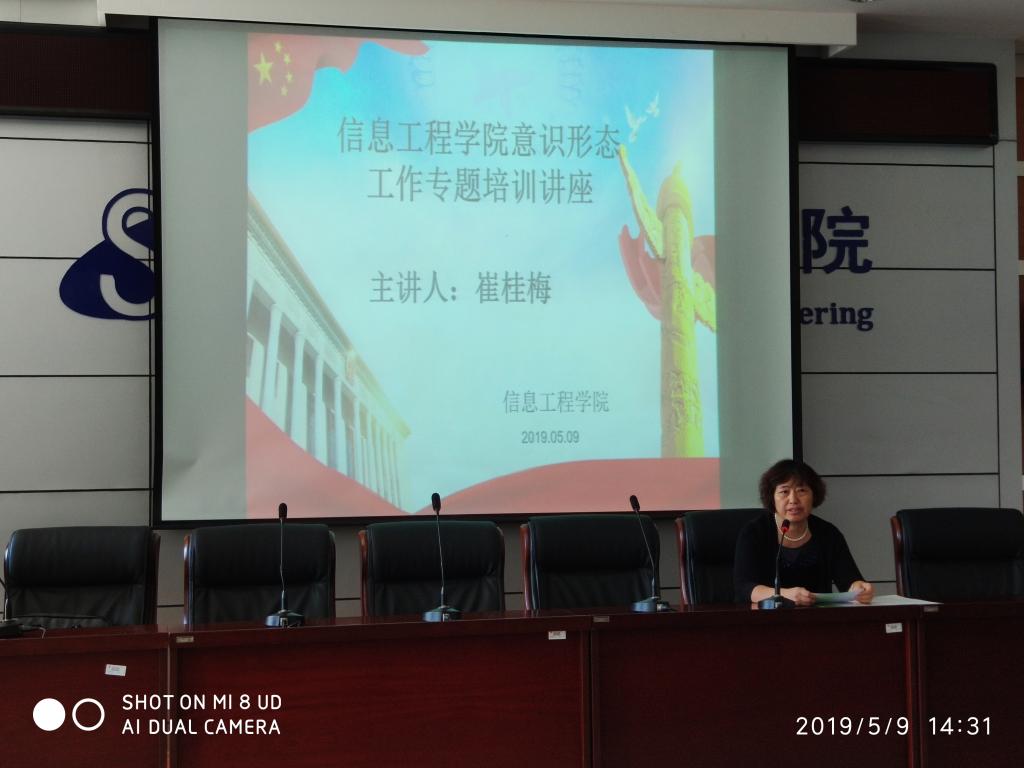 2019年5月9日下午,信息工程学院举办意识形态专题讲座,学院党总支书记崔桂梅教授开讲,学院党政领导以及学院全体教职工一同参加此次培训。