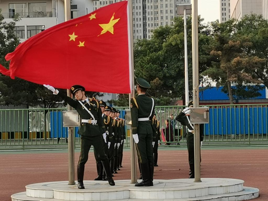 全体同学唱国歌、行注目礼,庄严肃穆。五星红旗冉冉升起,迎风飘扬。在场的每一个人向国旗行注目礼,深怀对祖国无限的热爱和崇高的敬意。