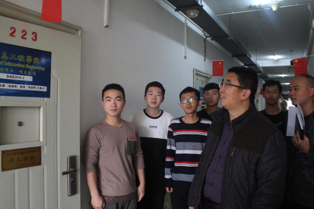 活动中,段志峰老师一行走访了退伍学生宿舍,对学生们退伍复学后遇到的问题进行了详细的询问和解答,他表示,创建退伍学生示范宿舍是信息工程学院推动学生公寓文明建设、增强学生责任意识的重要举措,具有十分重要的意义,要做到:第一,亮军人身份,树军人榜样。“军人宿舍”意味着军人身份在全体学生面前再一次亮明。他倡导退伍学生要时刻按照军人的标准严格要求自己,积极发挥军人榜样作用,以自身带动全寝室,从而以退伍军人示范宿舍为依托,带动全院学生努力营造温馨整洁的公寓氛围,形成良好的学习风气。第二,明责任意识,抓公寓建设。退伍军人示范宿舍意味着学生公寓建设与管理以军人宿舍为范本,全体退伍学生要以此为荣,更要以身作则。