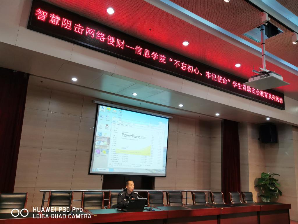 为进一步提高学校师生防范网络电信诈骗能力,强化师生自我保护意识,信息学院举办“不忘初心 牢记使命“学生资助安全教育系列活动之 “智慧阻击网络侵财”知识讲座。本次讲座邀请了包头市公安局网络安全保卫支队刘燕强警官为师生讲解。