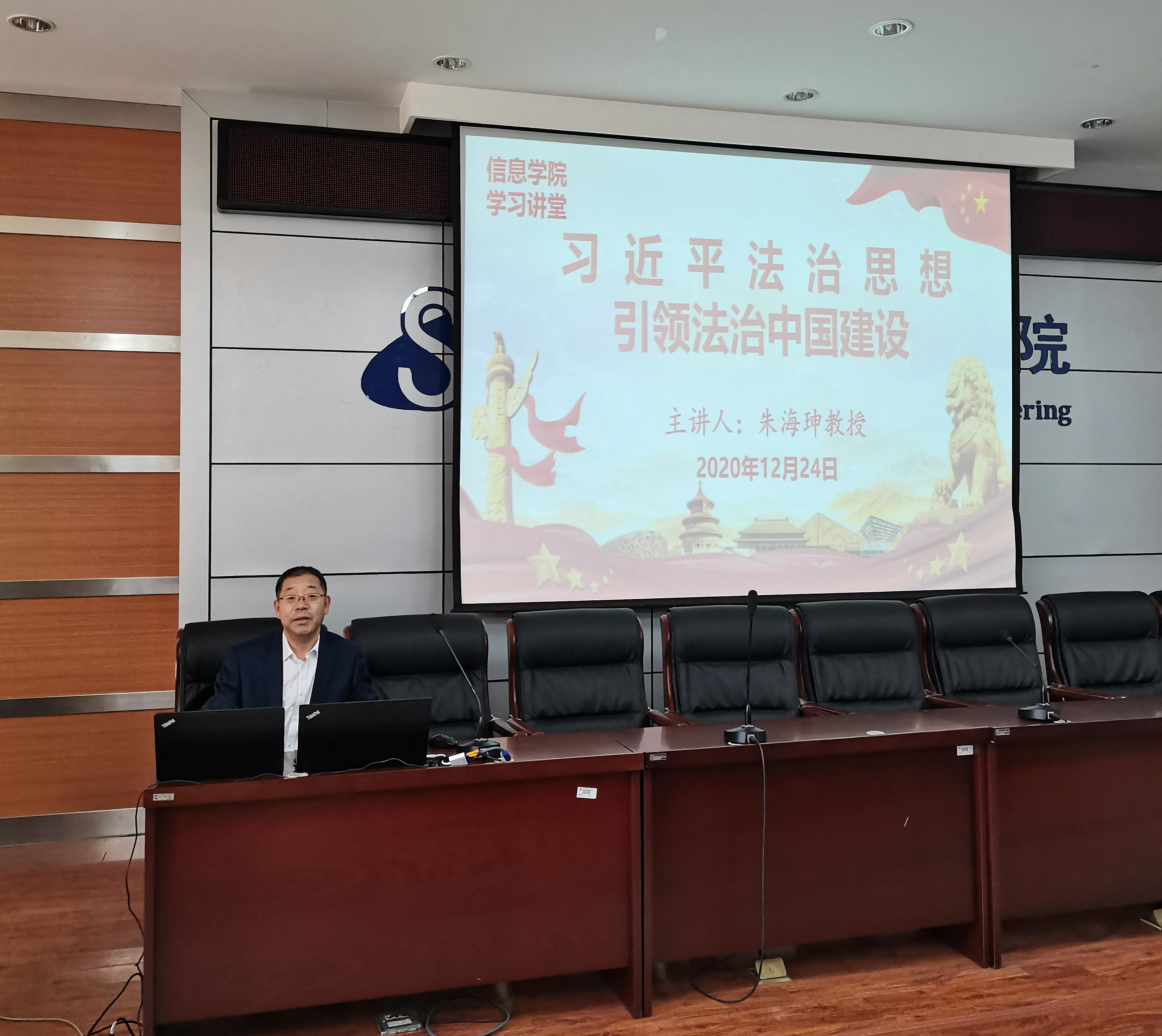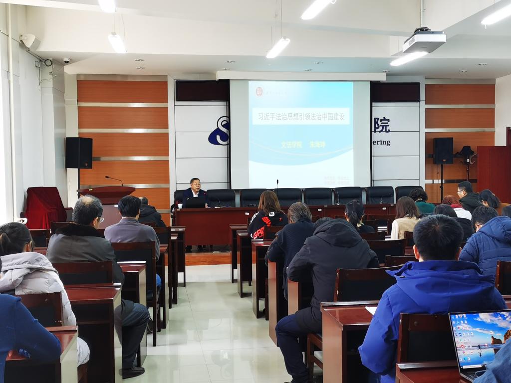 为深入学习贯彻习近平新时代中国特色社会主义思想,2020年12月24日下午,世界杯官网邀请文法学院朱海珅教授做题为《习近平法治思想引领法治中国建设》的专题讲座。世界杯官网党总支书记崔桂梅、院长李宝山和全体教职工参加了讲座。