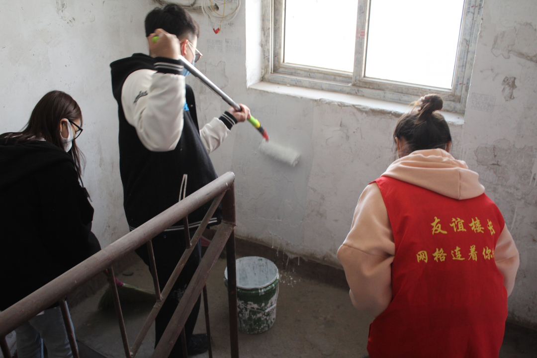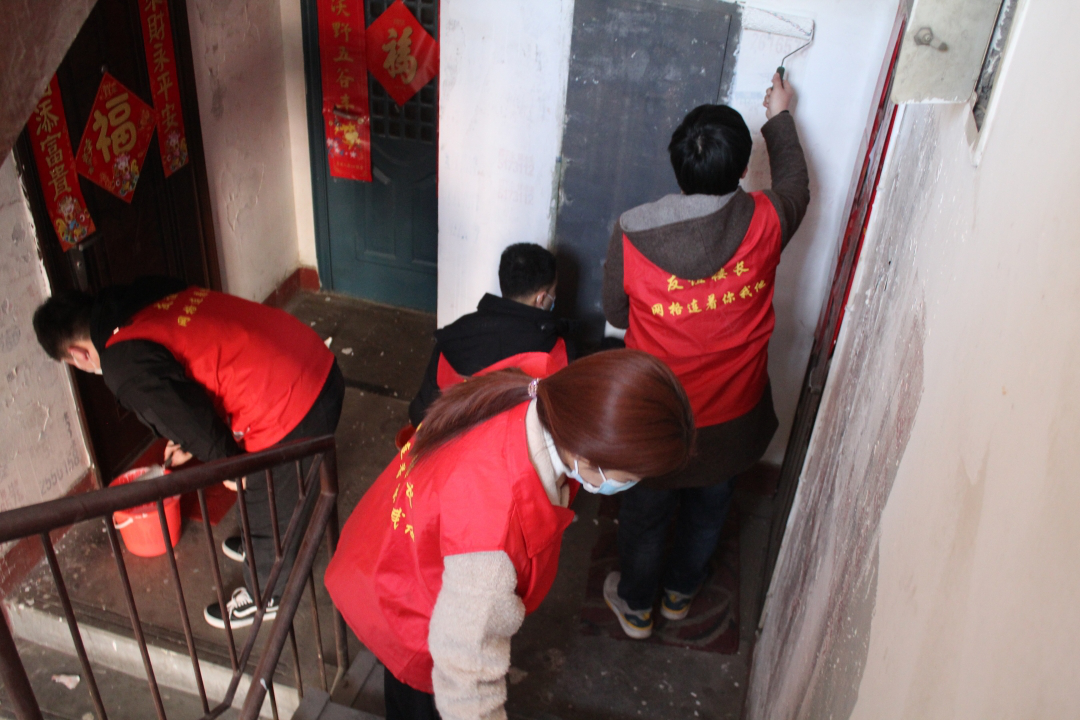 其他小组的党员、团员志愿者们拿着刷子以及扫把等工具对楼道里的垃圾进行清理。