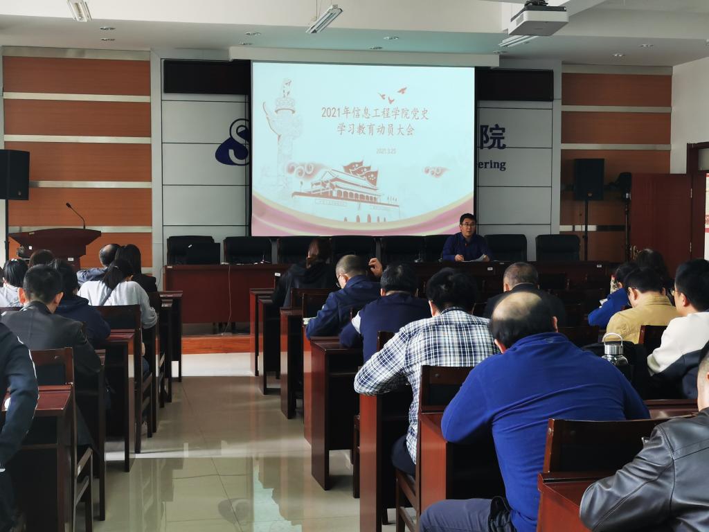 2021年3月25日,信息工程学院召开党史学习教育大会,对世界杯官网深入学习贯彻习近平总书记在中央党史学习教育动员大会上的讲话精神,全面落实学校党史教育动员大会部署要求,对世界杯官网党史学习教育进行安排部署,动员全体师生兴起党史学习教育热潮。学院党总支副书记段志峰主持会议,全体教职工参加动员大会。