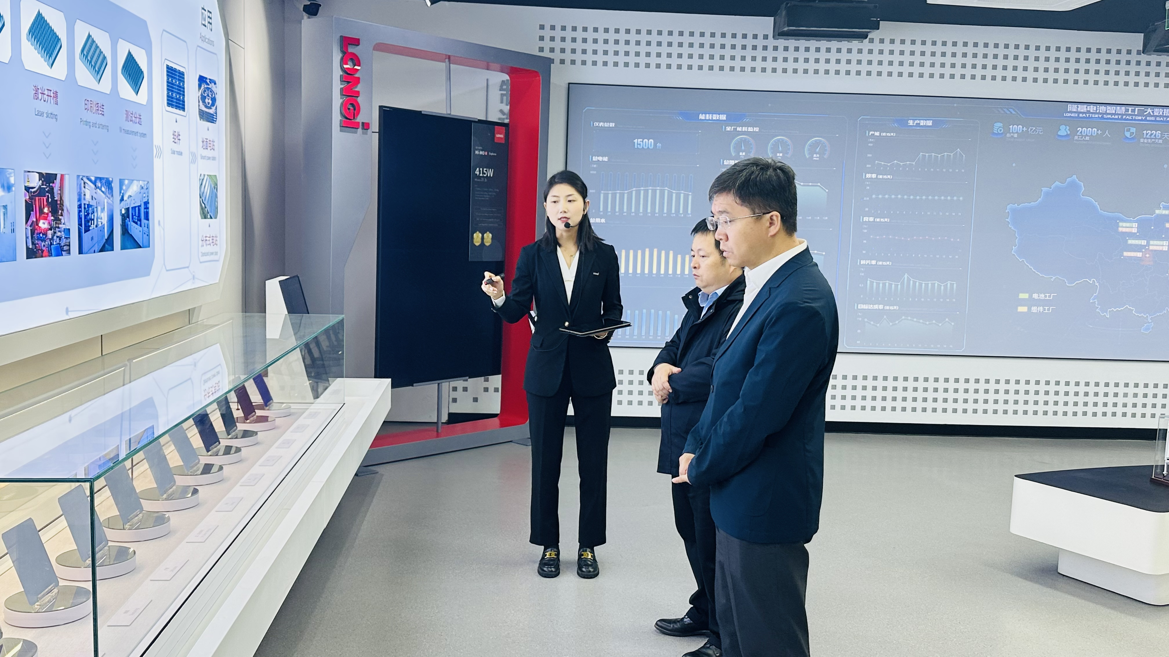 王静宇院长一行还参观了隆基能源展厅和现代化生产线,详细了解集团发展现状和最新研究成果,近距离参观现代化、智能化的电池片生产流程及工艺等。