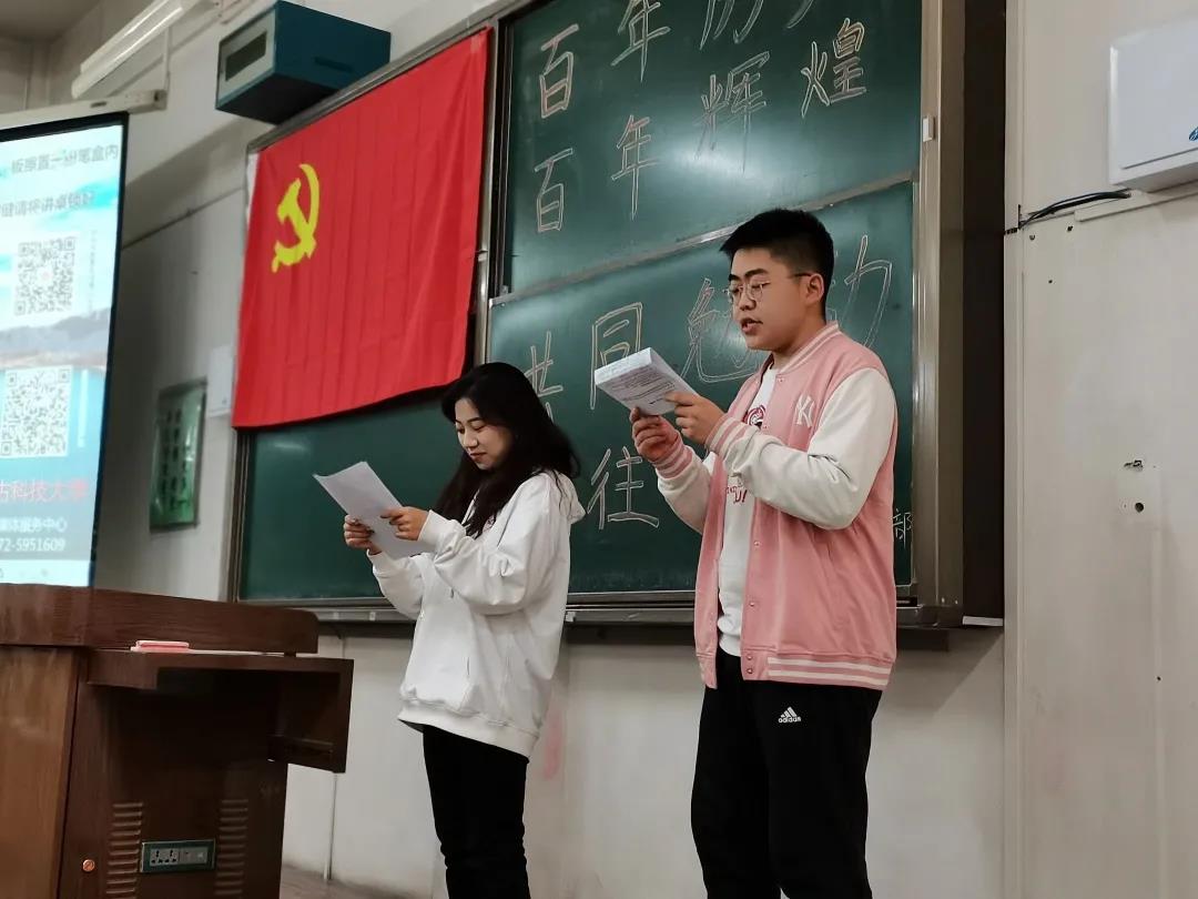 百年风雨兼程,世纪沧桑巨变。今年是中国共产党成立100周年,在一百年的非凡奋斗历程中,一代又一代中国共产党人顽强拼搏、不懈奋斗,涌现了一大批视死如归的革命烈士、一大批顽强奋斗的英雄人物、一大批忘我奉献的先进模范,形成了一系列伟大精神,构筑起了中国共产党人的精神谱系。为了让同学们更深刻的了解党的这伟大的一百年,通信电信学生党支部于2021年03月21日晚上7:00在主教F208举行了主题为“百年历史,百年辉煌”的支部党课。本次党课的主持人是邓宇琪同学和王章屹同学。