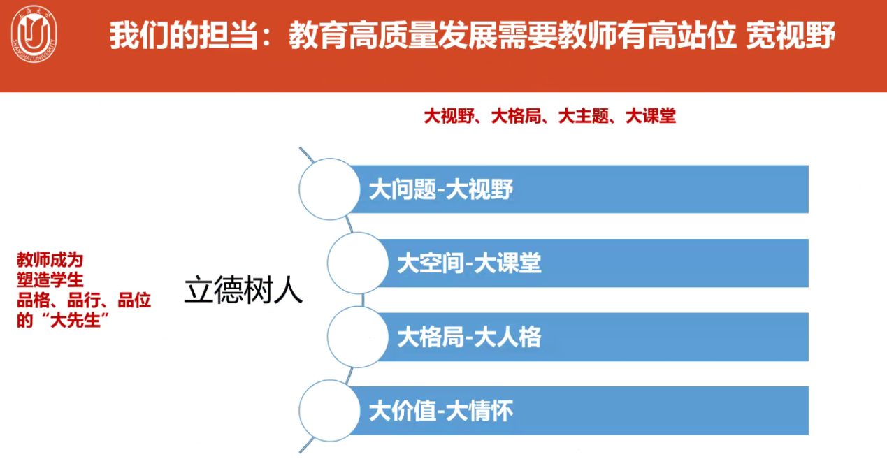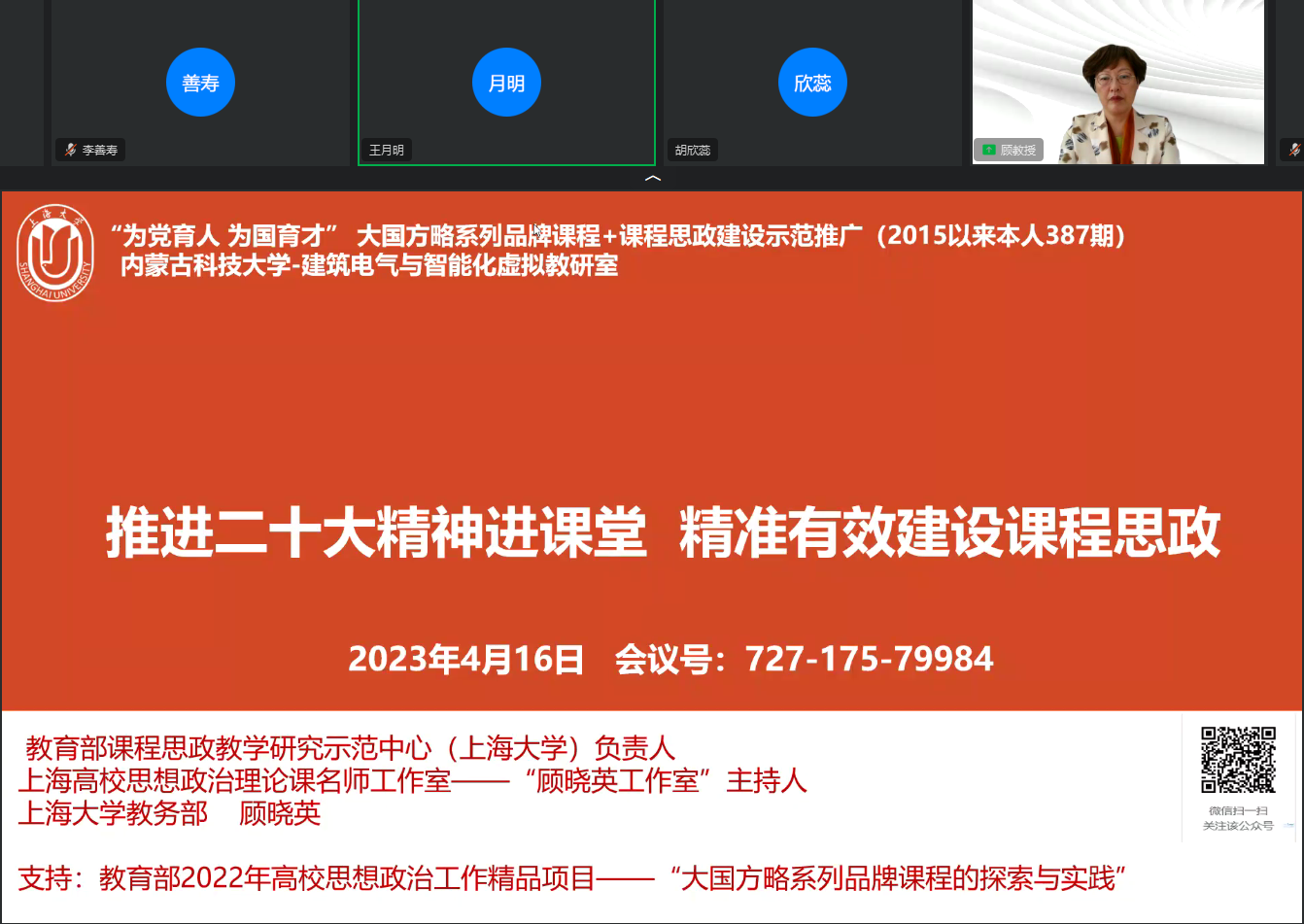 上海大学马克思主义学院法学博士顾晓英教授以“推进党的二十大精神进课堂,精准有效建设课程思政”为主题,通过通俗易懂的方法,详细阐释了如何将党的二十大精神融入课堂,并精确地构建课程思政。