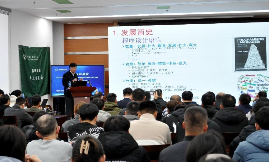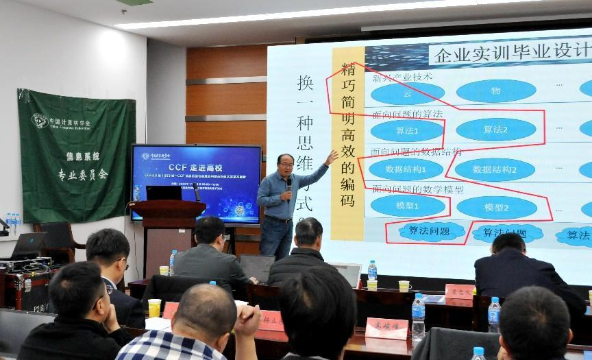 陶先平教授从学科建设与学生培养的角度出发,做了题为“从《问题求解》课程看一流课程和一流专业建设”的精彩报告,围绕专业能力和思政建设两个方面,从自身的教育经历讲述高校要怎样培养人才,提出了以学生能力培养为中心,以思政培养为目的的教学思想,并从教学内容要明确、教学方法要适宜、教学资源要充足、考核手段要合理等具体内容进行了细致的讲解。